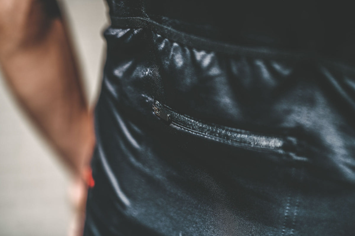 Three spacious back pockets hold food and a phone, while angled openings provide easy access while riding. An additional zippered pocket holds smaller items.